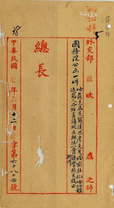 國務院(民國07年06月)。[件名:哈薩克烏克爾達巴彥克戈塔前往扎哈沁旗一案請會核見復由]。《數位典藏與數位學習聯合目錄》。http://catalog.digitalarchives.tw/item/00/0a/3b/25.html(2025/05/20瀏覽)。