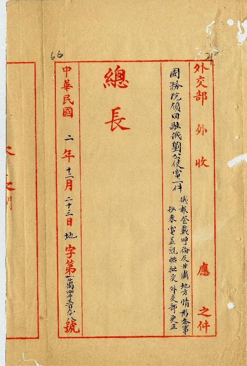 駐俄劉公使(民國02年12月)。[件名:俄報登載呼倫及甘肅地方情形各事抄來電並說帖批交外交部更正由]。《數位典藏與數位學習聯合目錄》。http://catalog.digitalarchives.tw/item/00/0a/3b/56.html(2025/05/20瀏覽)。