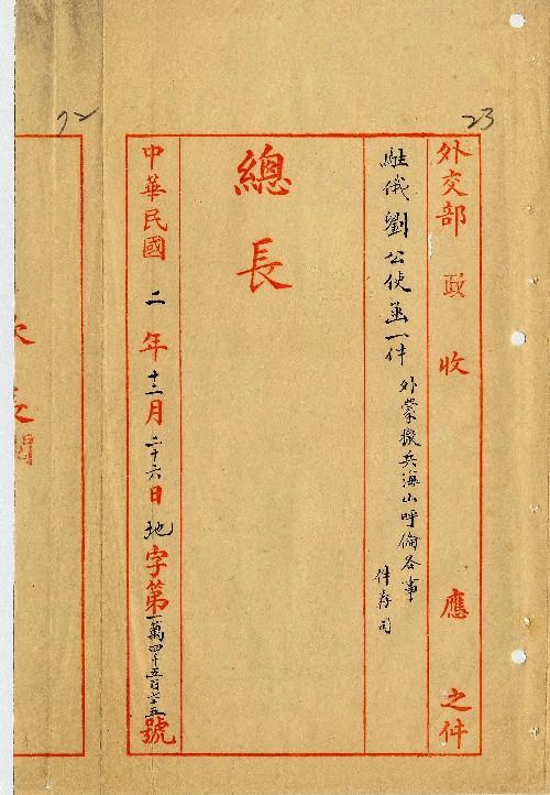 駐俄劉公使(民國02年12月)。[件名:外蒙撤兵海山呼倫各事]。《數位典藏與數位學習聯合目錄》。http://catalog.digitalarchives.tw/item/00/0a/3b/58.html(2025/05/20瀏覽)。