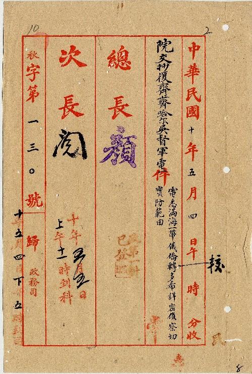 國務院(民國10年05月)。[件名:電悉滿海一帶俄僑轉多希詳密偵察切實防範由]。《數位典藏與數位學習聯合目錄》。http://catalog.digitalarchives.tw/item/00/0a/3c/32.html(2025/05/20瀏覽)。