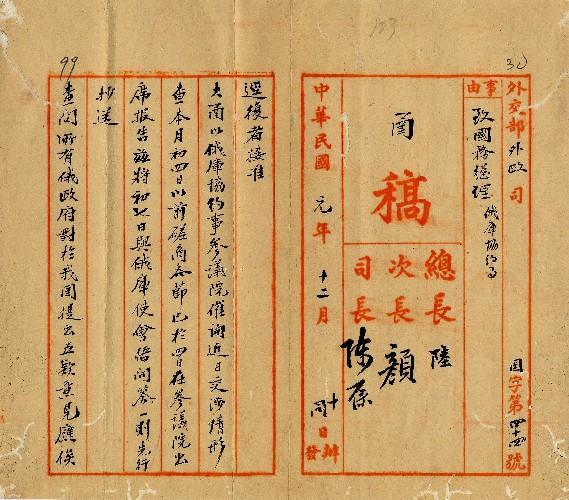 外交部(民國01年12月)。[件名:抄送與俄使問答]。《數位典藏與數位學習聯合目錄》。http://catalog.digitalarchives.tw/item/00/0a/3d/30.html(2025/05/20瀏覽)。