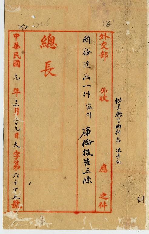 國務院(民國01年12月)。[件名:抄送庫倫報告三條請查照]。《數位典藏與數位學習聯合目錄》。http://catalog.digitalarchives.tw/item/00/0a/3d/49.html(2025/05/20瀏覽)。
