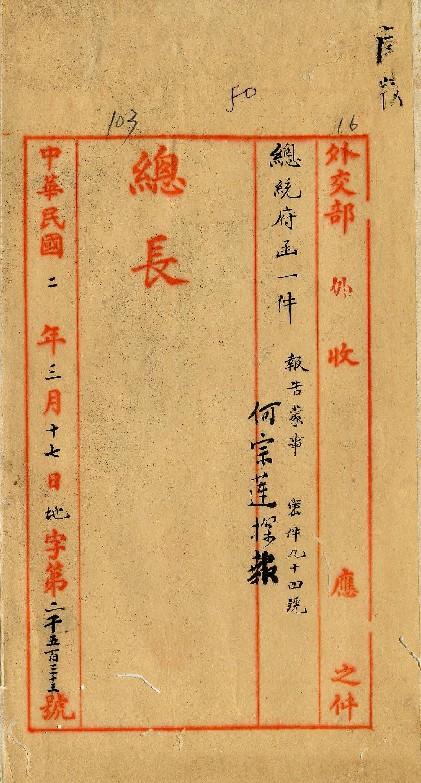 大總統府軍事處(民國02年03月)。[件名:抄送何宗蓮探報告]。《數位典藏與數位學習聯合目錄》。http://catalog.digitalarchives.tw/item/00/0a/3d/a5.html(2025/05/20瀏覽)。