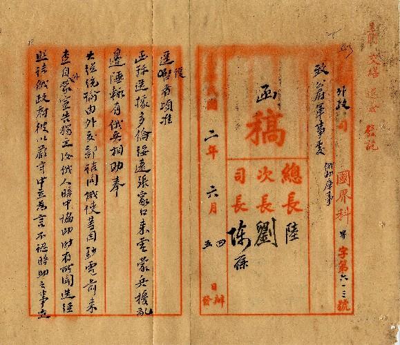 外交部(民國02年06月)。[件名:俄助庫事據電詰問料無效果不如嚴飭防軍痛擊蒙匪]。《數位典藏與數位學習聯合目錄》。http://catalog.digitalarchives.tw/item/00/0a/3d/e2.html(2025/05/20瀏覽)。
