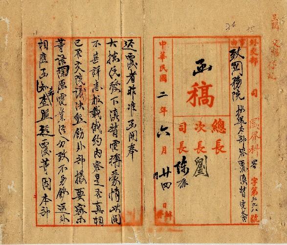 外交部(民國02年06月)。[件名:函聞已將磋商俄約情形其內容撮要電復滇督]。《數位典藏與數位學習聯合目錄》。http://catalog.digitalarchives.tw/item/00/0a/3d/ec.html(2025/05/20瀏覽)。