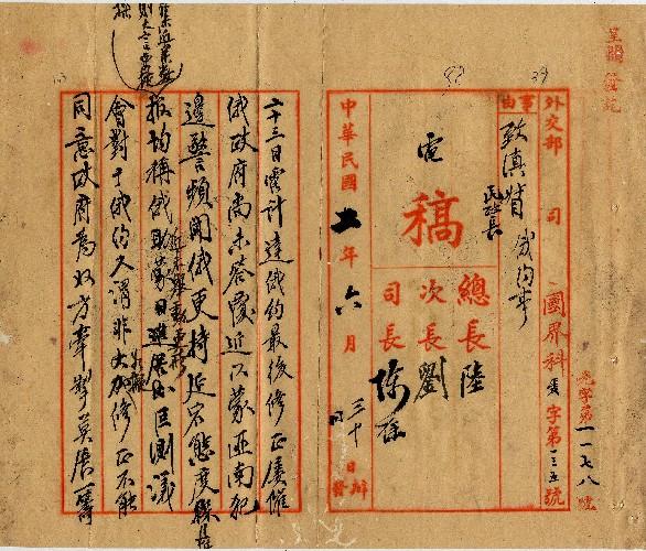 外交部(民國02年06月)。[件名:俄約事為雙方牽掣時電徵卓見]。《數位典藏與數位學習聯合目錄》。http://catalog.digitalarchives.tw/item/00/0a/3d/f0.html(2025/05/20瀏覽)。