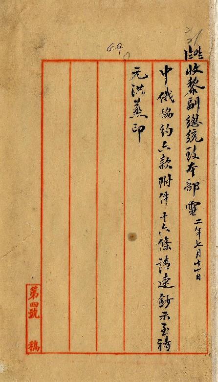 黎副總統(民國02年07月)。[件名:請鈔示中俄協約六款并附件]。《數位典藏與數位學習聯合目錄》。http://catalog.digitalarchives.tw/item/00/0a/3e/08.html(2025/05/20瀏覽)。