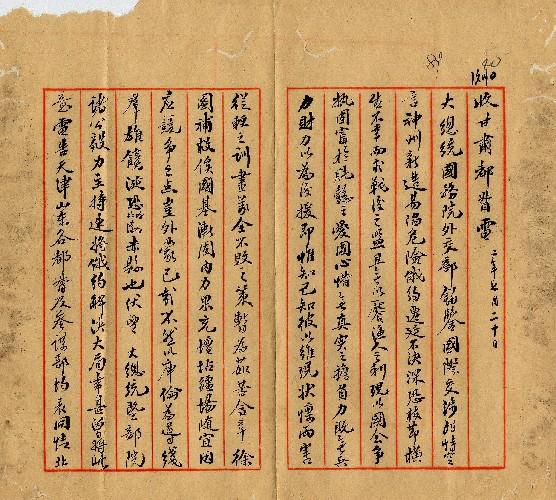 甘肅都督(民國02年07月)。[件名:俄約請速解決均表同情]。《數位典藏與數位學習聯合目錄》。http://catalog.digitalarchives.tw/item/00/0a/3e/1b.html(2025/05/20瀏覽)。