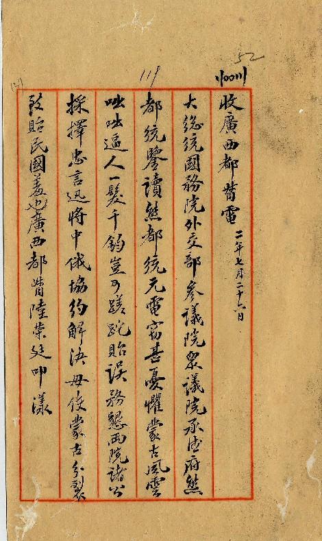 廣西都督(民國02年07月)。[件名:懇迅將中俄協約解決]。《數位典藏與數位學習聯合目錄》。http://catalog.digitalarchives.tw/item/00/0a/3e/27.html(2025/05/20瀏覽)。