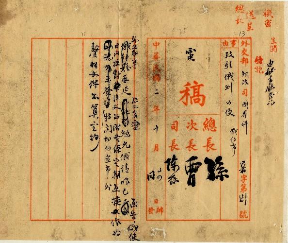 外交部(民國02年10月)。[件名:俄約定期互換切勿宣布]。《數位典藏與數位學習聯合目錄》。http://catalog.digitalarchives.tw/item/00/0a/3e/6a.html(2025/05/20瀏覽)。