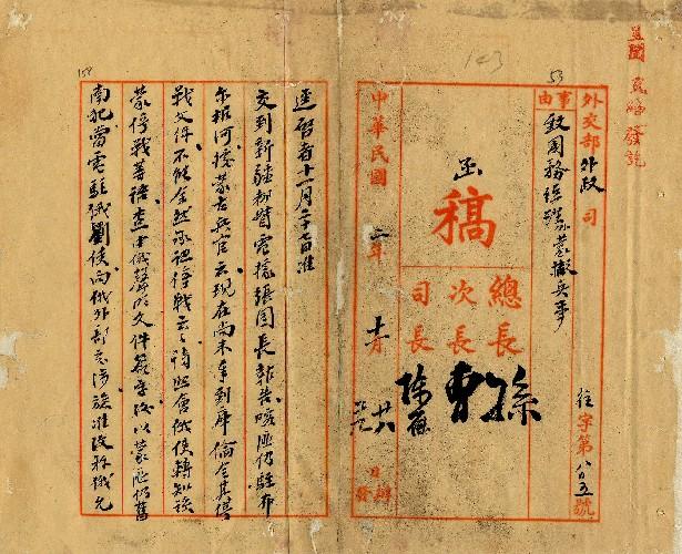 外交部(民國02年11月)。[件名:外蒙撤兵事]。《數位典藏與數位學習聯合目錄》。http://catalog.digitalarchives.tw/item/00/0a/3e/a7.html(2025/05/20瀏覽)。