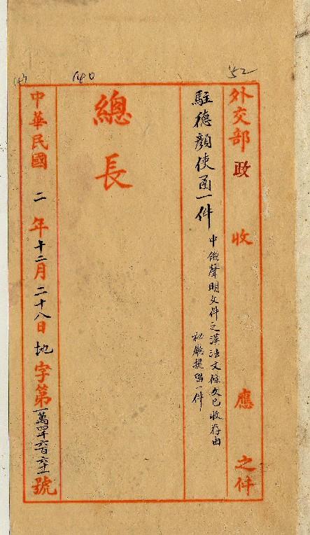 駐德顏公使(民國02年12月)。[件名:中俄聲明文件之漢法文條文已收存]。《數位典藏與數位學習聯合目錄》。http://catalog.digitalarchives.tw/item/00/0a/3e/dd.html(2025/05/20瀏覽)。