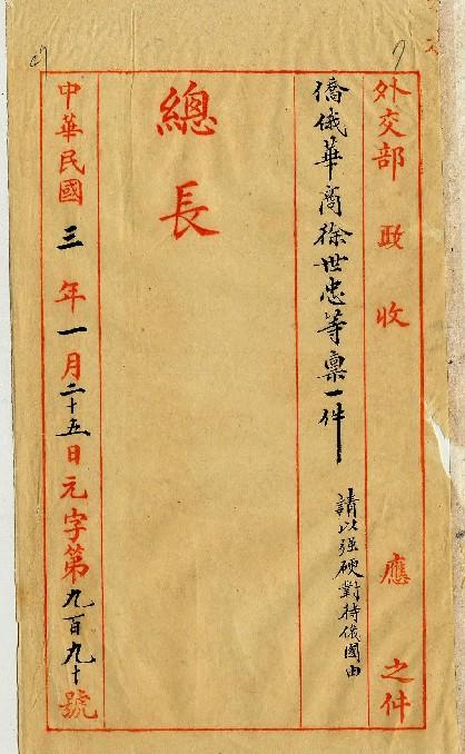 僑俄華商徐世忠等(民國03年01月)。[件名:俄人背約助蒙請以強硬對待]。《數位典藏與數位學習聯合目錄》。http://catalog.digitalarchives.tw/item/00/0a/3e/e8.html(2025/05/20瀏覽)。