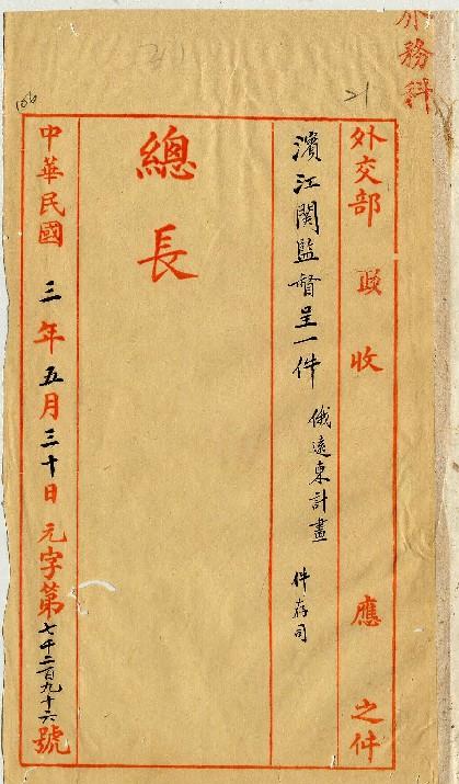 濱江關監督(民國03年05月)。[件名:俄政府對遠東計劃函述詳情用備預防]。《數位典藏與數位學習聯合目錄》。http://catalog.digitalarchives.tw/item/00/0a/3e/f4.html(2025/05/20瀏覽)。
