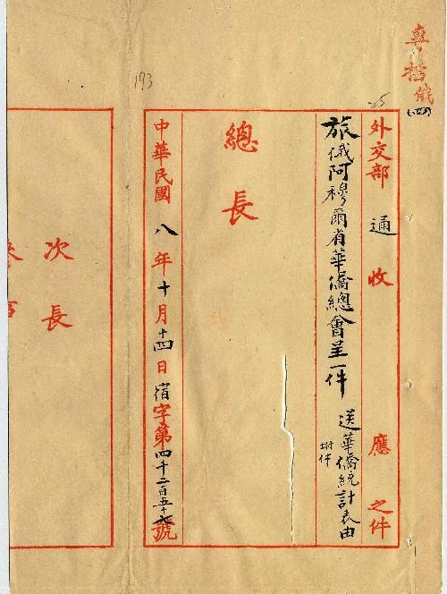 旅俄阿穆爾省華僑總會(民國08年10月)。[件名:送華僑統計表]。《數位典藏與數位學習聯合目錄》。http://catalog.digitalarchives.tw/item/00/0a/a7/f6.html(2025/05/20瀏覽)。