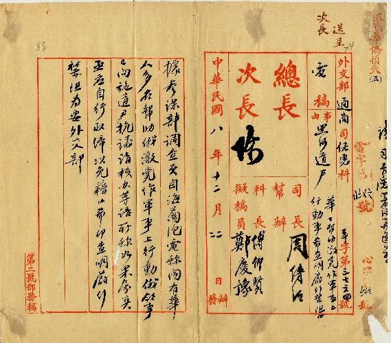 外交部(民國08年12月)。[件名:華工幫助激黨作軍事上行動事希查明嚴禁由]。《數位典藏與數位學習聯合目錄》。http://catalog.digitalarchives.tw/item/00/0a/a8/a0.html(2025/05/20瀏覽)。