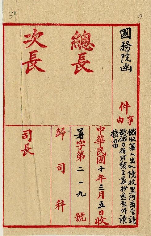 國務院(民國10年03月)。[件名:俄收華人出入境稅黑河商會請力持封鎖主義抄送原呈請核辦]。《數位典藏與數位學習聯合目錄》。http://catalog.digitalarchives.tw/item/00/0a/a8/c5.html(2025/05/20瀏覽)。
