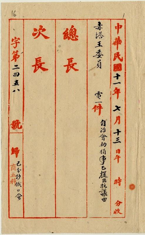 赤塔王委員(民國11年07月)。[件名:自治會勒捐已提出抗議]。《數位典藏與數位學習聯合目錄》。http://catalog.digitalarchives.tw/item/00/0a/aa/a9.html(2025/05/20瀏覽)。