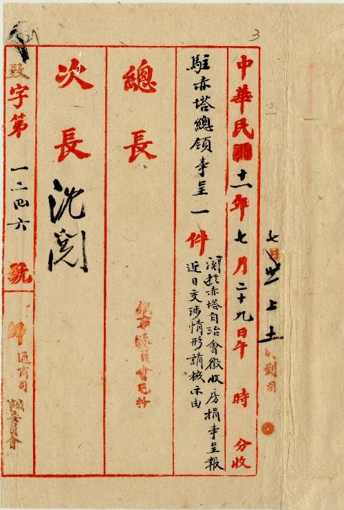 駐赤塔總領事(民國11年07月)。[件名:赤塔自治會征收戶捐事呈報近日交涉情形請核示]。《數位典藏與數位學習聯合目錄》。http://catalog.digitalarchives.tw/item/00/0a/aa/ab.html(2025/05/20瀏覽)。