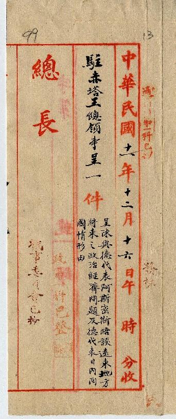 駐赤塔王總領事(民國11年12月)。[件名:呈陳與德代表阿斯密斯晤談遠東政治問題]。《數位典藏與數位學習聯合目錄》。http://catalog.digitalarchives.tw/item/00/0a/ab/04.html(2025/05/20瀏覽)。