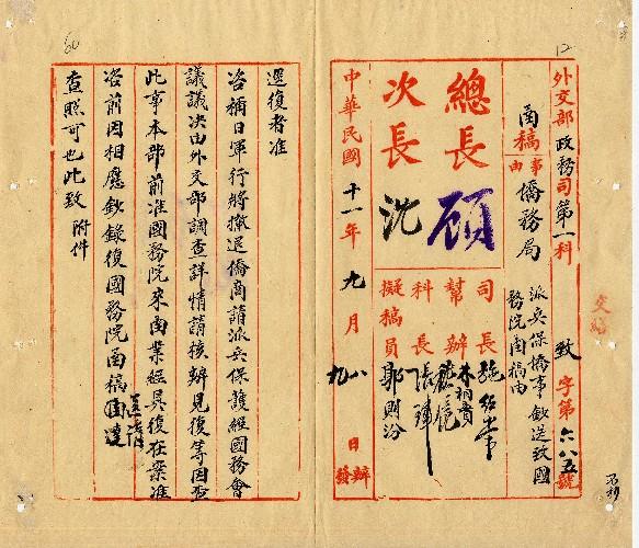 外交部(民國11年09月)。[件名:派兵保僑事抄送致國務院函稿]。《數位典藏與數位學習聯合目錄》。http://catalog.digitalarchives.tw/item/00/0a/ab/14.html(2025/05/20瀏覽)。