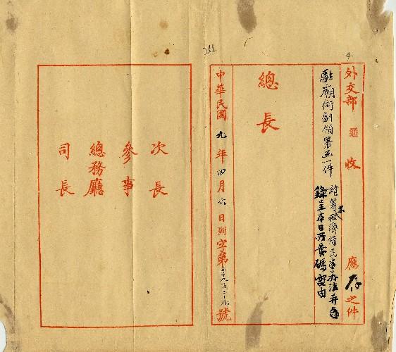 駐廟街副領署(民國09年03月)。[件名:請籌示救濟華僑辦法并錄呈本日所發碼電]。《數位典藏與數位學習聯合目錄》。http://catalog.digitalarchives.tw/item/00/0a/ab/b2.html(2025/05/20瀏覽)。