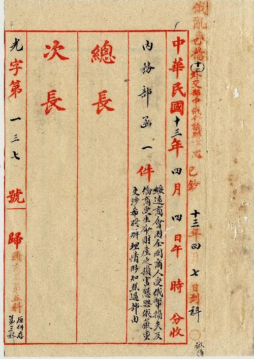 內務部(民國13年04月)。[件名:綏遠商會因全國商人受俄幣損失等懇與俄交涉希將辦理情形知照過部由]。《數位典藏與數位學習聯合目錄》。http://catalog.digitalarchives.tw/item/00/0a/ad/f9.html(2025/05/20瀏覽)。