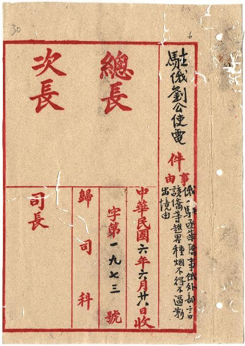 駐俄劉公使(民國06年06月)。[件名:俄人驅逐華僑事俄外部言該僑等越界種煙不得不逼勒出境由]。《數位典藏與數位學習聯合目錄》。http://catalog.digitalarchives.tw/item/00/0a/b0/7f.html(2025/05/20瀏覽)。