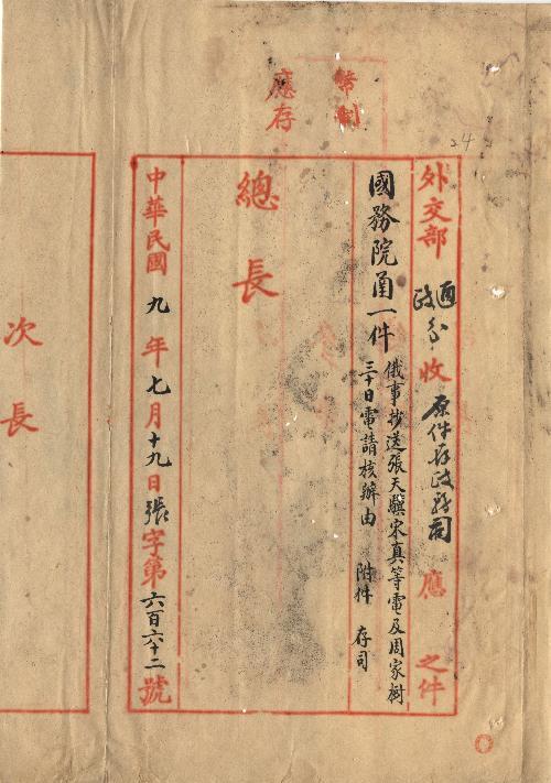 國務院(民國09年07月)。[件名:俄事抄送張天驥宋真等電及周家樹三十日電請核辦由]。《數位典藏與數位學習聯合目錄》。http://catalog.digitalarchives.tw/item/00/0a/b1/c0.html(2025/05/20瀏覽)。
