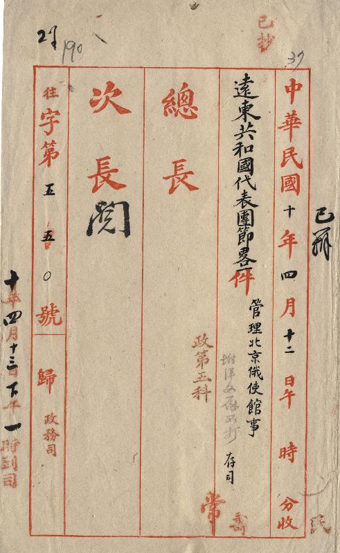 遠東共和國代表團(民國10年04月)。[件名:管理北京俄使館事]。《數位典藏與數位學習聯合目錄》。http://catalog.digitalarchives.tw/item/00/0a/b3/7e.html(2025/05/20瀏覽)。