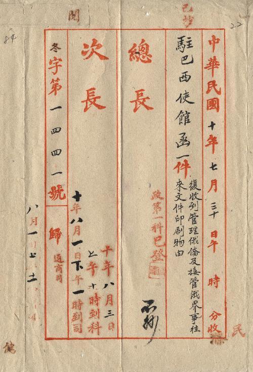 駐巴西使館(民國10年04月)。[件名:函復收到管理俄僑及接管俄界事往來文件印刷物由]。《數位典藏與數位學習聯合目錄》。http://catalog.digitalarchives.tw/item/00/0a/b4/10.html(2025/05/20瀏覽)。