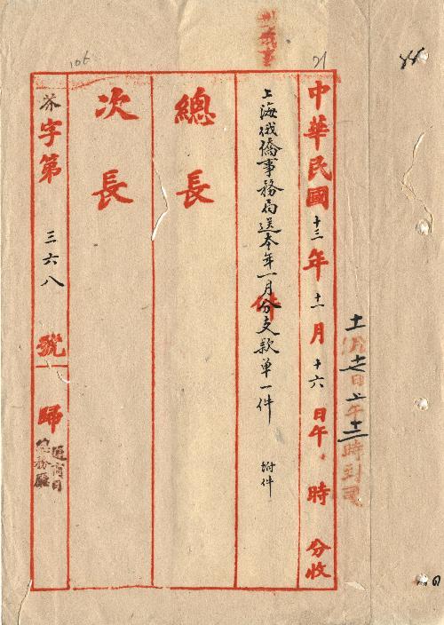 上海俄僑事務局(民國13年11月)。[件名:十三年一月份支款單]。《數位典藏與數位學習聯合目錄》。http://catalog.digitalarchives.tw/item/00/0a/b5/bb.html(2025/05/20瀏覽)。