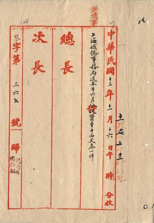 上海俄僑事務局(民國13年11月)。[件名:十三年六月份收費單]。《數位典藏與數位學習聯合目錄》。http://catalog.digitalarchives.tw/item/00/0a/b5/c1.html(2025/05/20瀏覽)。