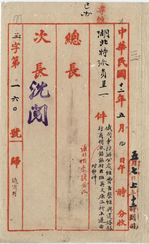 湖北特派員(民國12年05月)。[件名:俄事辦公處經費告罄經與道勝銀行商借照錄該行原函請示遵由]。《數位典藏與數位學習聯合目錄》。http://catalog.digitalarchives.tw/item/00/0a/b6/64.html(2025/05/20瀏覽)。