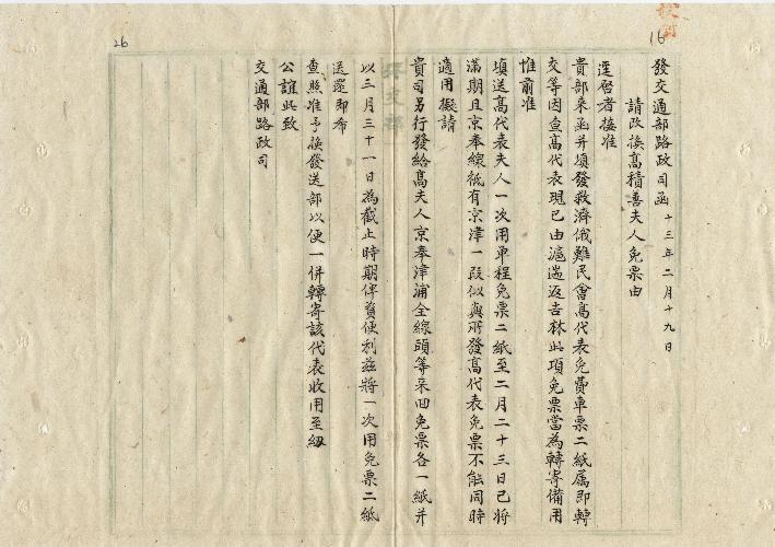 外交部(民國13年02月)。[件名:請改換高積善夫人免票]。《數位典藏與數位學習聯合目錄》。http://catalog.digitalarchives.tw/item/00/0a/b7/bb.html(2025/05/20瀏覽)。