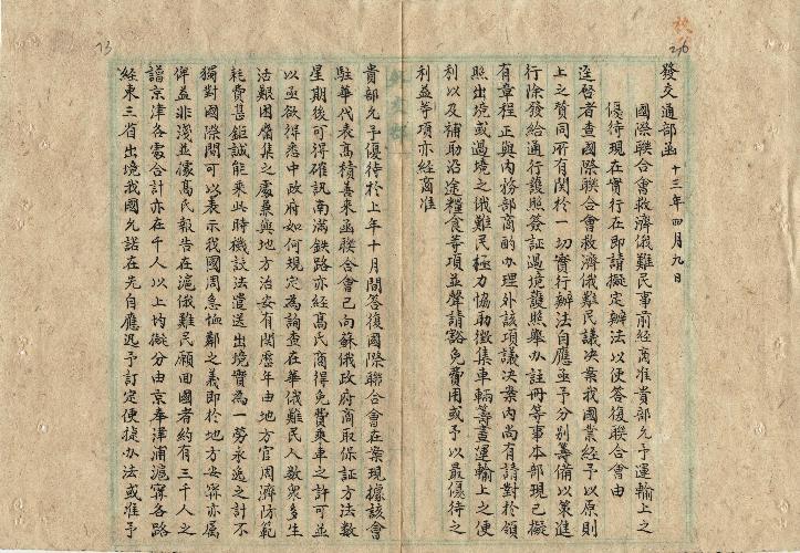 外交部(民國13年04月)。[件名:國際聯合會救濟俄難民事前經商准貴部允予運輸上之優待現在實行在即請擬定辦法以便答復聯合會]。《數位典藏與數位學習聯合目錄》。http://catalog.digitalarchives.tw/item/00/0a/b7/cf.html(2025/05/20瀏覽)。