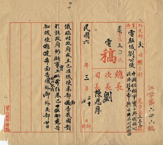 外交部(民國06年03月)。[件名:本國仍願事實上與俄臨時政府往來希轉告臨時政府]。《數位典藏與數位學習聯合目錄》。http://catalog.digitalarchives.tw/item/00/0a/b9/73.html(2025/05/20瀏覽)。