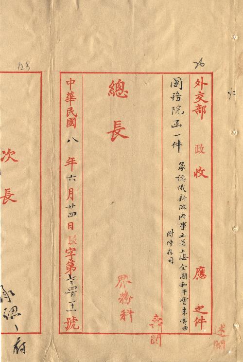 國務院(民國08年06月)。[件名:承認俄新政府函送上海全國和平會來電由]。《數位典藏與數位學習聯合目錄》。http://catalog.digitalarchives.tw/item/00/0a/b9/c2.html(2025/05/20瀏覽)。