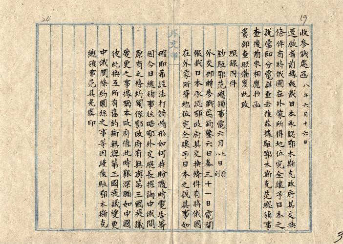 參戰處(民國08年06月)。[件名:報載日本承認鄂政府事函送范總領事來電由]。《數位典藏與數位學習聯合目錄》。http://catalog.digitalarchives.tw/item/00/0a/b9/d8.html(2025/05/20瀏覽)。