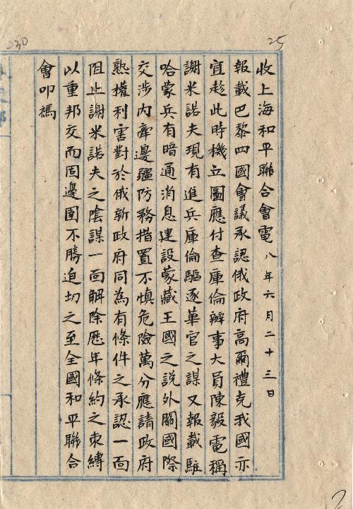 上海和平聯合會(民國08年06月)。[件名:請承認俄新政府由]。《數位典藏與數位學習聯合目錄》。http://catalog.digitalarchives.tw/item/00/0a/b9/de.html(2025/05/20瀏覽)。