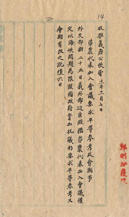 駐義唐公使(民國11年11月)。[件名:勞農代表加入會議要求平等參考及會期事]。《數位典藏與數位學習聯合目錄》。http://catalog.digitalarchives.tw/item/00/0a/ba/c5.html(2025/05/20瀏覽)。