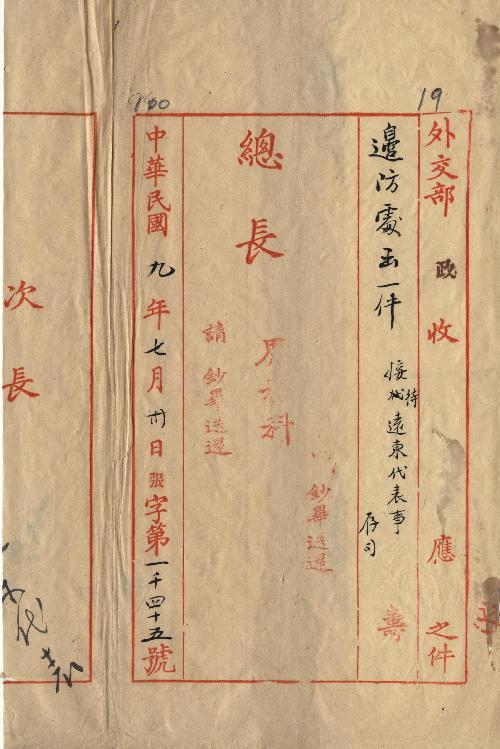 邊防處(民國09年07月)。[件名:接待遠東代表事]。《數位典藏與數位學習聯合目錄》。http://catalog.digitalarchives.tw/item/00/0a/ba/fe.html(2025/05/20瀏覽)。