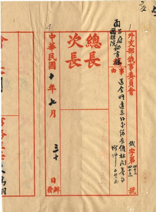 外交部俄事委員會(民國10年07月)。[件名:送會晤遠東外交總長優林問答事]。《數位典藏與數位學習聯合目錄》。http://catalog.digitalarchives.tw/item/00/0a/bb/b2.html(2025/05/20瀏覽)。