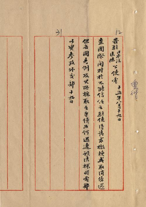 外交部(民國15年08月)。[件名:探詢取銷大使待遇先例及所取之手續為何由]。《數位典藏與數位學習聯合目錄》。http://catalog.digitalarchives.tw/item/00/0a/bc/1e.html(2025/05/20瀏覽)。