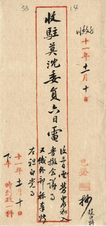 駐莫沈委員(民國11年11月)。[件名:收三日電勞農加入魯撒會議事又俄外部稱奉張左袒白黨事]。《數位典藏與數位學習聯合目錄》。http://catalog.digitalarchives.tw/item/00/0a/bd/66.html(2025/05/20瀏覽)。