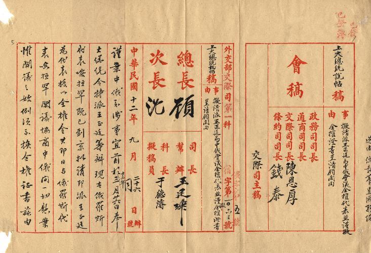 外交部(民國12年09月)。[件名:擬派王正廷為中俄會議全權代表並謹擬全權證書呈請鈞墨?]。《數位典藏與數位學習聯合目錄》。http://catalog.digitalarchives.tw/item/00/0a/bf/ee.html(2025/05/20瀏覽)。