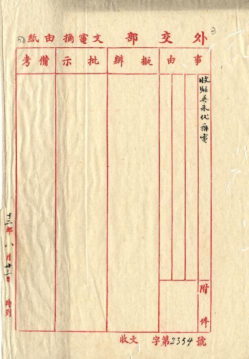 駐英朱代辦(民國13年08月)。[件名:復電述英不干涉俄事委員允向俄使商電吳京從速開中俄會議]。《數位典藏與數位學習聯合目錄》。http://catalog.digitalarchives.tw/item/00/0a/c1/d5.html(2025/05/20瀏覽)。
