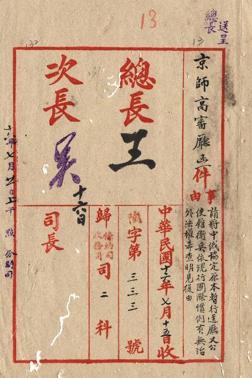 京師高審廳(民國16年07月)。[件名:請將中俄協定原本暫行送廳又公使館衛兵依現行國際慣例有無治外法權希查明見復]。《數位典藏與數位學習聯合目錄》。http://catalog.digitalarchives.tw/item/00/0a/c2/b3.html(2025/05/20瀏覽)。