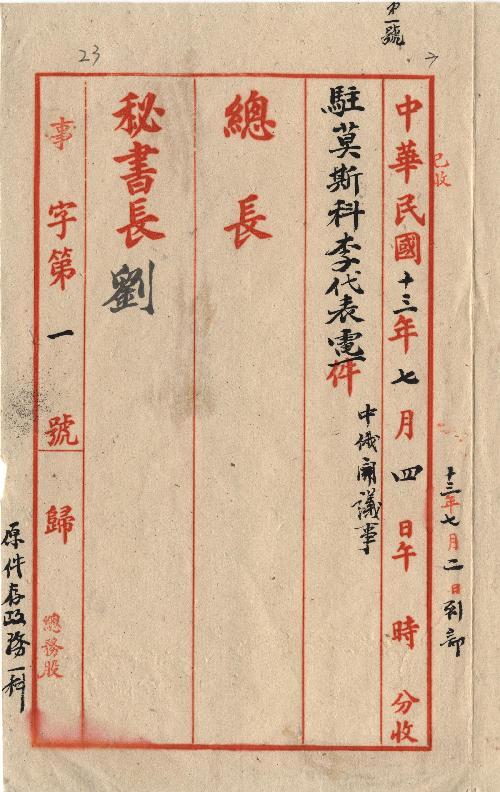 駐莫斯科李代表(民國13年07月)。[件名:電陳中俄會議事並請抄寄有關中俄交涉案件由]。《數位典藏與數位學習聯合目錄》。http://catalog.digitalarchives.tw/item/00/0a/c3/cf.html(2025/05/20瀏覽)。