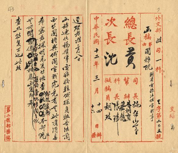外交部(民國12年03月)。[件名:新省電稱法俄宣戰事想係邊地傳聞之說]。《數位典藏與數位學習聯合目錄》。http://catalog.digitalarchives.tw/item/00/0a/c6/78.html(2025/05/20瀏覽)。